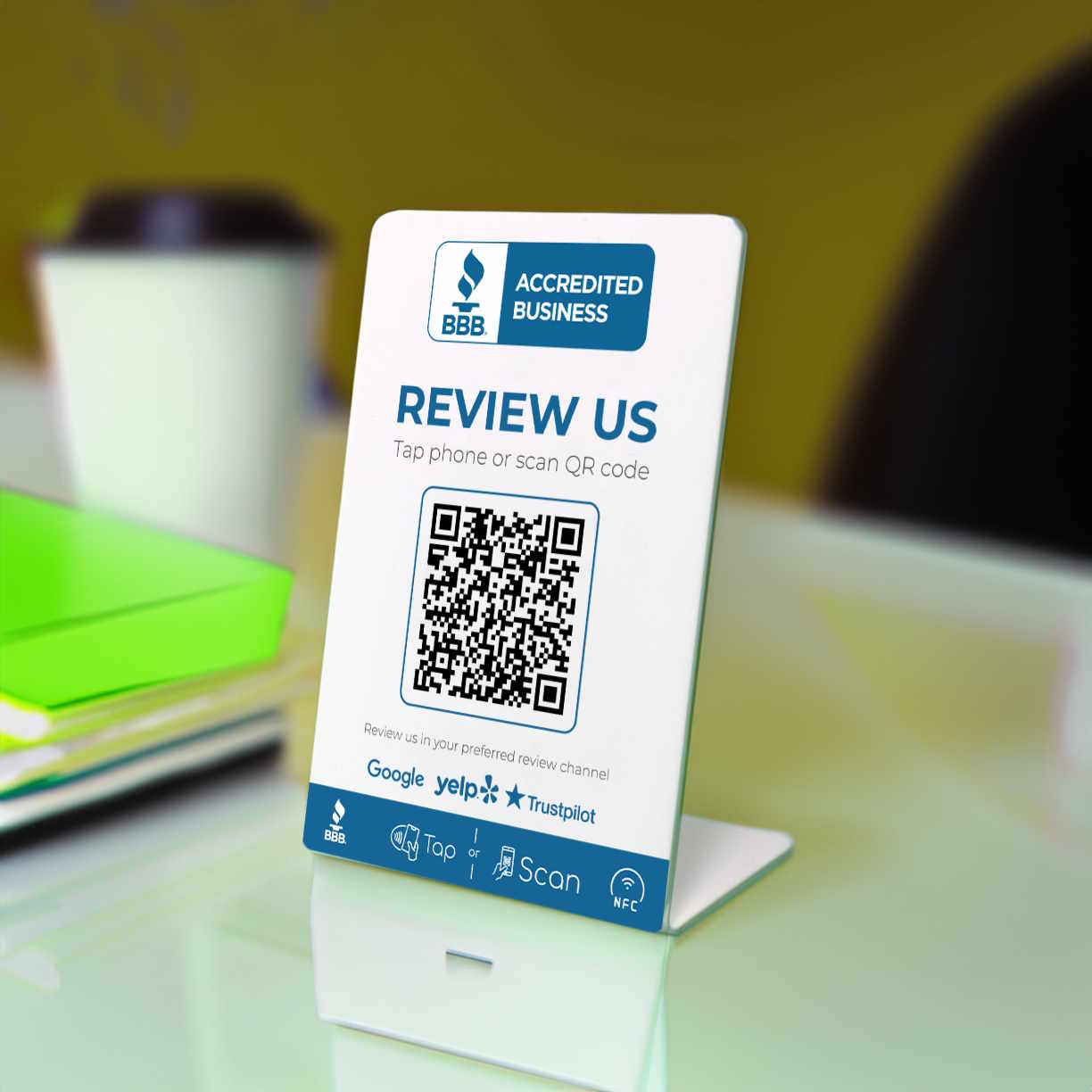 Choose a stand, sticker, business card, or review card — based on where customers interact with you.