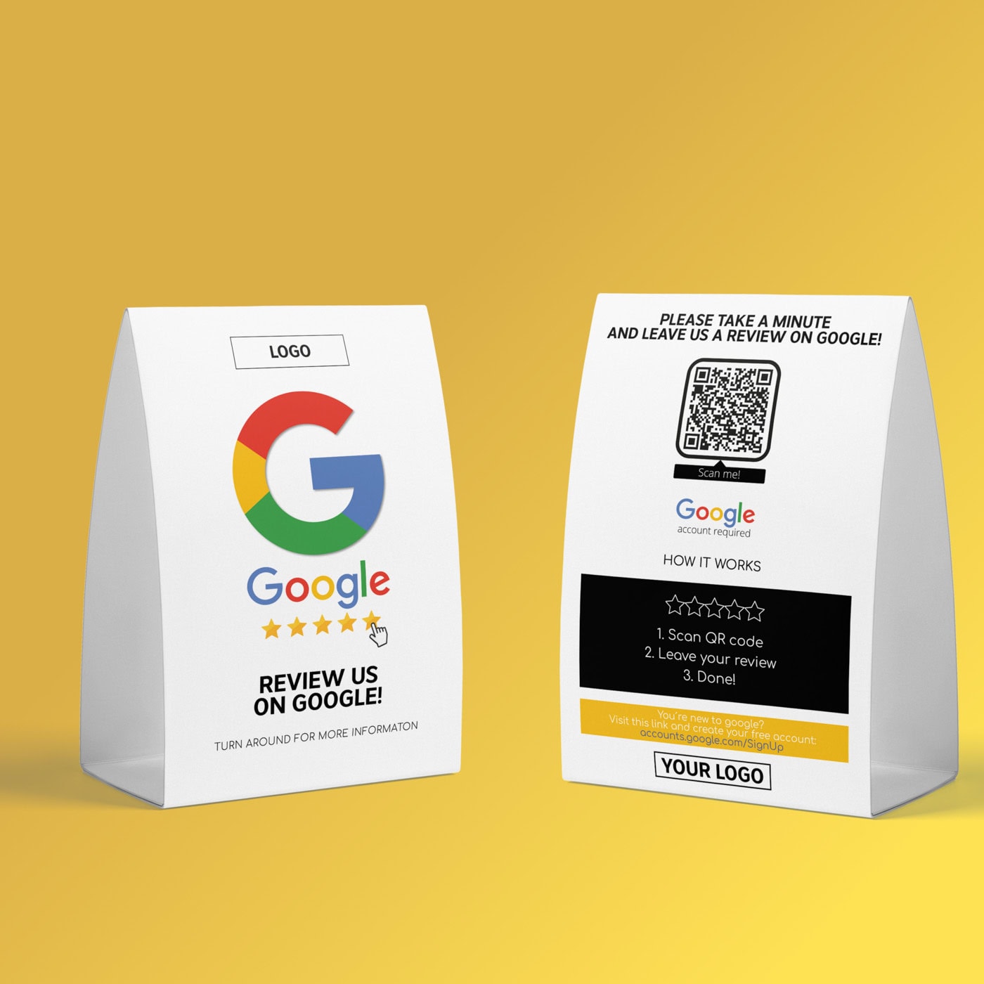 Du kan nemt tilpasse bordteltet “Anmeld os på Google” med dit logo og tilpasse dem til din virksomhed.