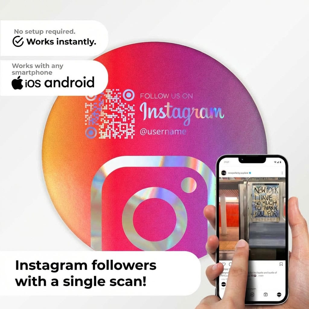 Instagram QR Code Sticker “Iconic” (Hologram Edition) kombinerer moderne design med maksimal synlighed.