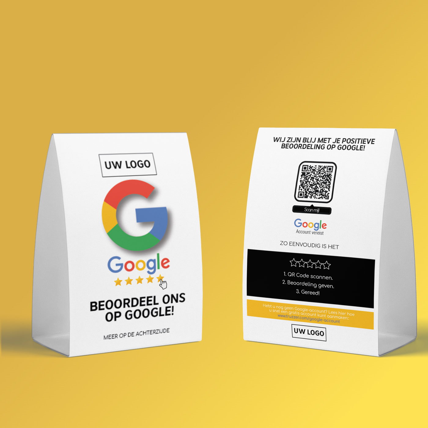 Met de truzzer “Beoordeel ons op Google” tafelkaarten kun je sneller positieve beoordelingen van je klanten krijgen en je imago en reputatie verbeteren.