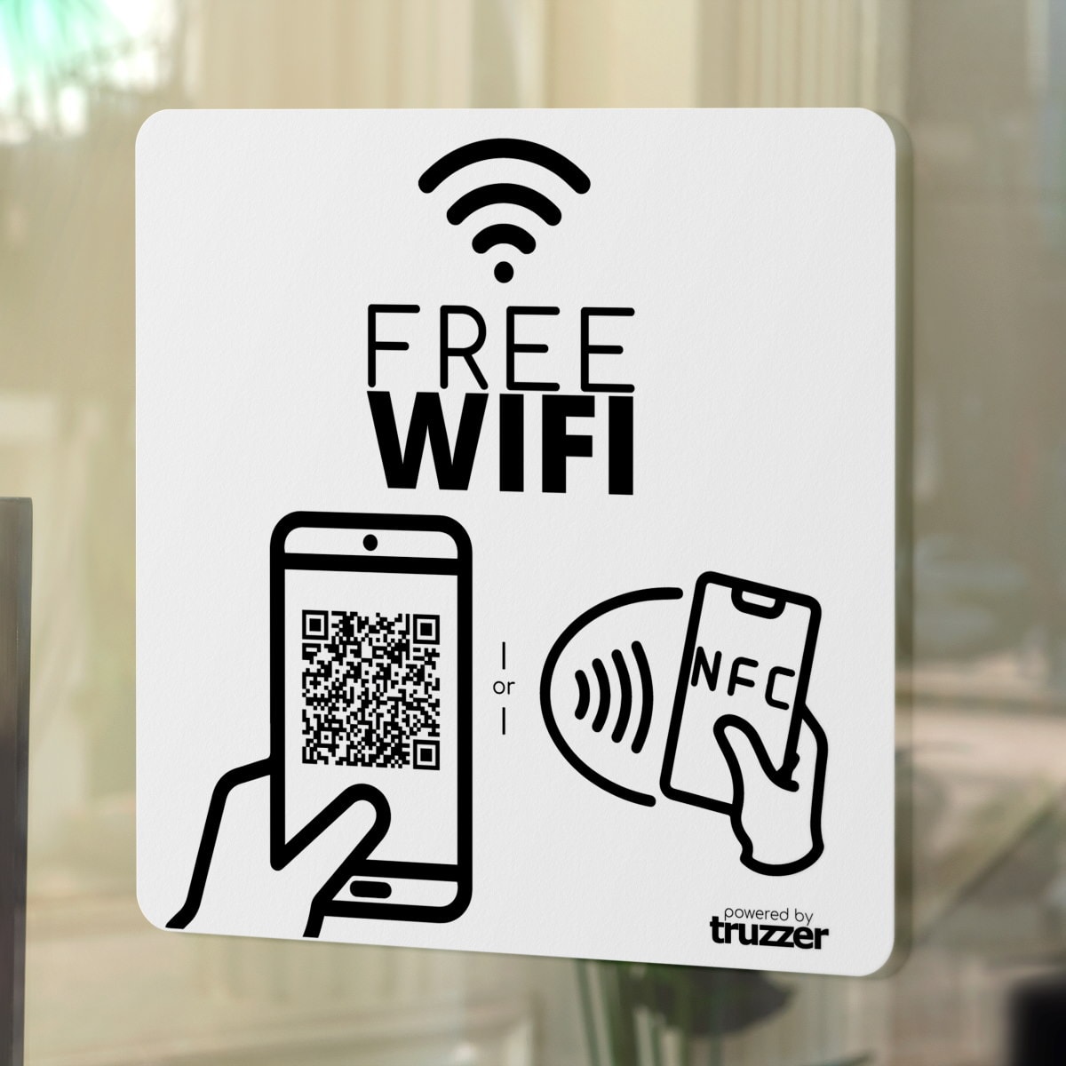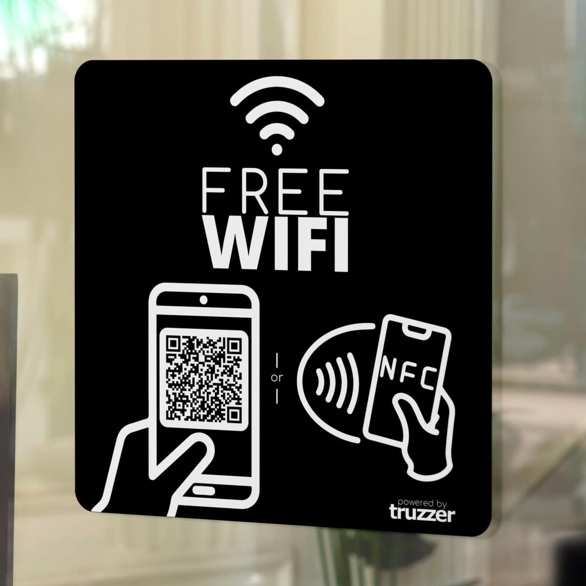 Truzzer WIFI NFC-klistremerker er små, selvklebende klistremerker som kan plasseres hvor som helst i en bedrift, for eksempel på et bord, en vegg eller produktutstilling. De inneholder både WIFI og NFC teknologi, som gjør at kunder raskt og enkelt kan koble seg til virksomhetens WIFI nettverk eller få tilgang til relevant informasjon om produkter eller tjenester. Klistremerkene er designet for å være brukervennlige, og kunder kan ganske enkelt trykke på sin NFC-aktiverte smarttelefon eller skanne QR-koden på klistremerket for å koble til nettverket eller få tilgang til informasjonen.