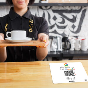 Google Reviews stickers with QR/NFC technology for permanent placement. Always visible, zero ongoing effort. Available as QR code, NFC, or QR + NFC variants.