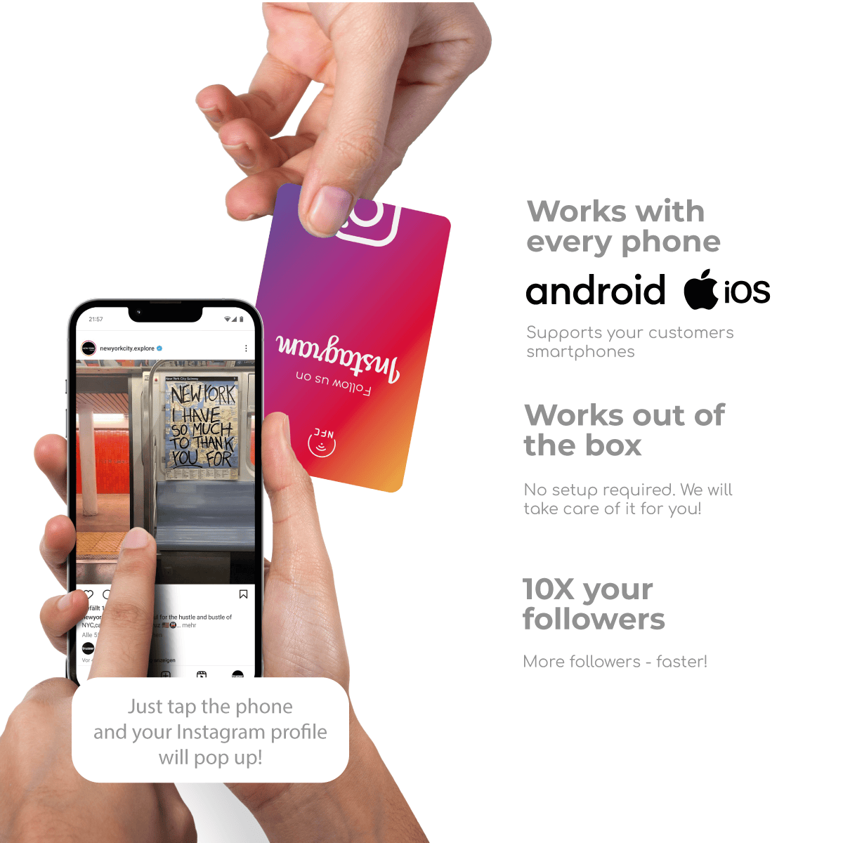 With the contactless Instagram NFC cards, you can easily win new Instagram followers directly on site.